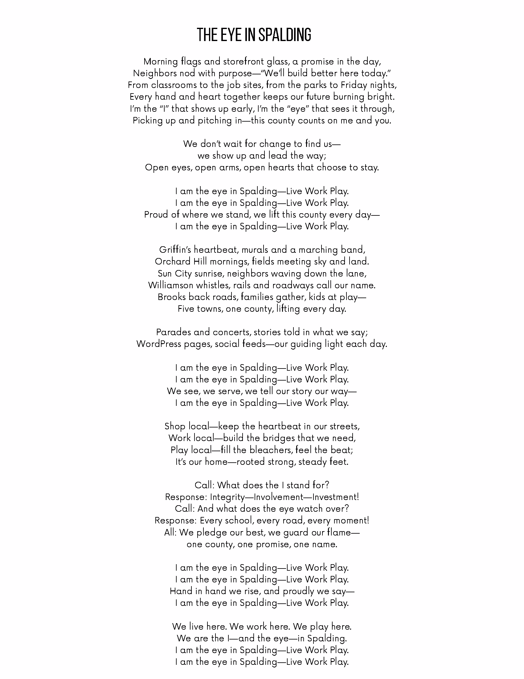 The Eye in Spalding serves as Spalding County’s official song, reflecting our shared heritage, civic pride, and commitment to the community.