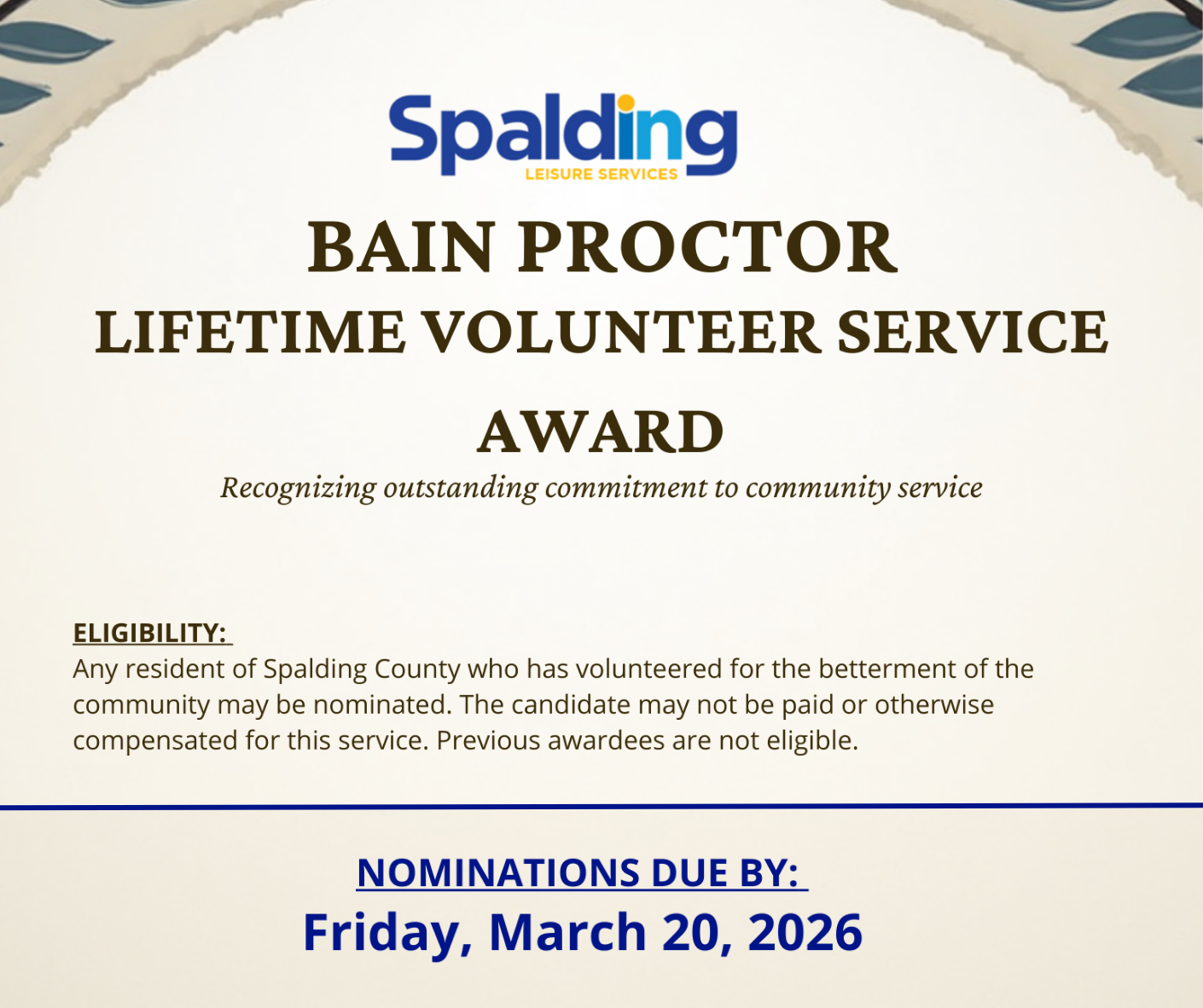 Spalding County Leisure Services is proud to announce that nominations are now open for the Bain Proctor Lifetime Volunteer Service Award, a prestigious honor recognizing individuals who have demonstrated exceptional dedication and long-standing. ommitment to ommunity service in Spalding County.